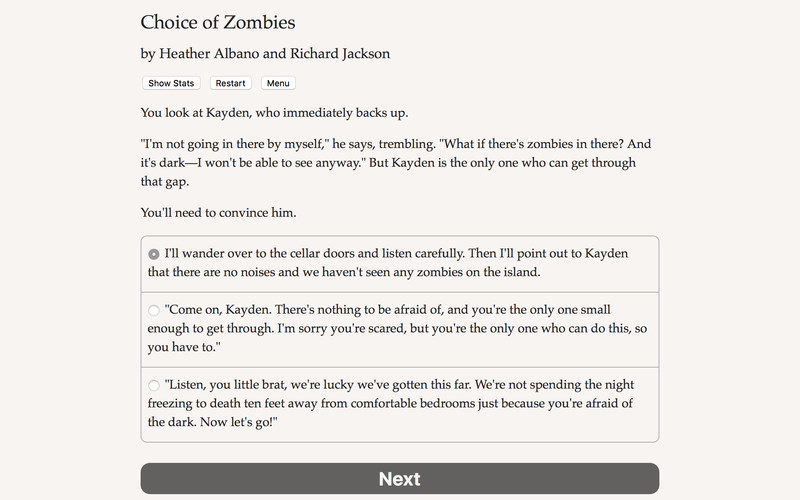 About This GameFight for survival in a world overrun by zombies! Can you stay alive long enough to get your friends to a place of safety? Will you keep your humanity intact or become a bloodthirsty zombie hunter? And will you discover the secret behind the zombie virus?"Choice of Zombies" is a 140,000 word interactive fantasy novel by Heather Albano and Richard Jackson, where your choices control the story. It's entirely text-based—without graphics or sound effects—and fueled by the vast, unstoppable power of your imagination. b4d347fde0